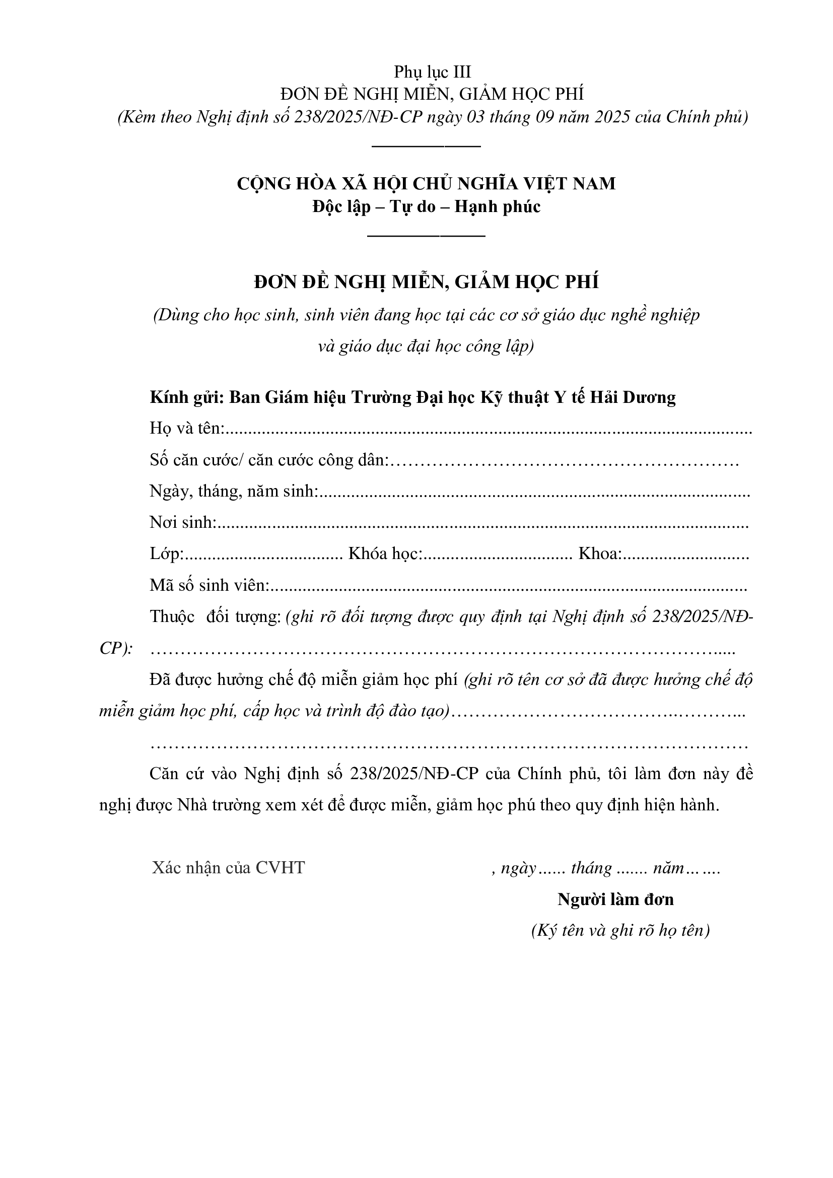 2025. ĐƠN XIN MIỄN GIẢM HỌC PHÍ