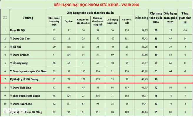 - Trường Đại học Kỹ thuật Y tế Hải Dương xếp thứ 7 các trường khối ngành Y dược và thứ 70 các trường Đại học theo bảng xếp hạng VNUR-2026
