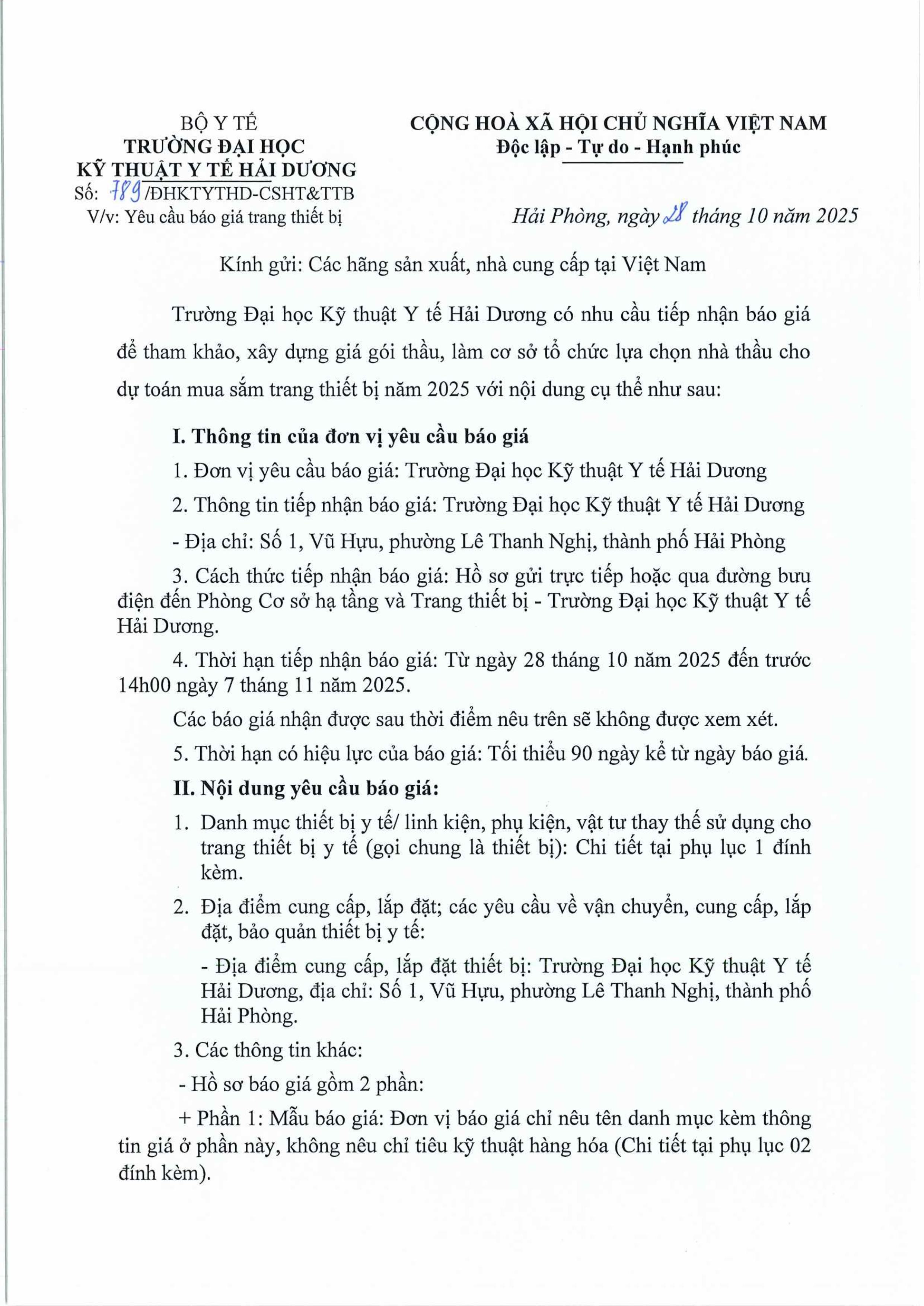 Thông báo Yêu cầu báo giá trang thiết bị (Số 789/ĐHKTYTHD-CSHT&TTB ngày 28/10/2025) Author: CNTT&TV HMTU