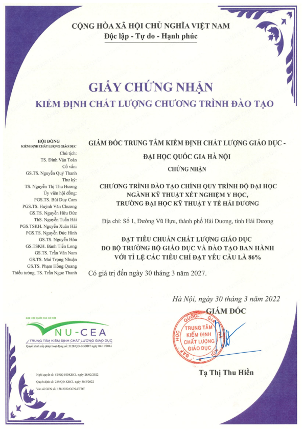 | 7 | Chứng nhận Kiểm định chất lượng chương trình đào tạo chính quy trình độ Đại học Ngành Kỹ thuật Xét nghiệm Y học | Chi tiết |