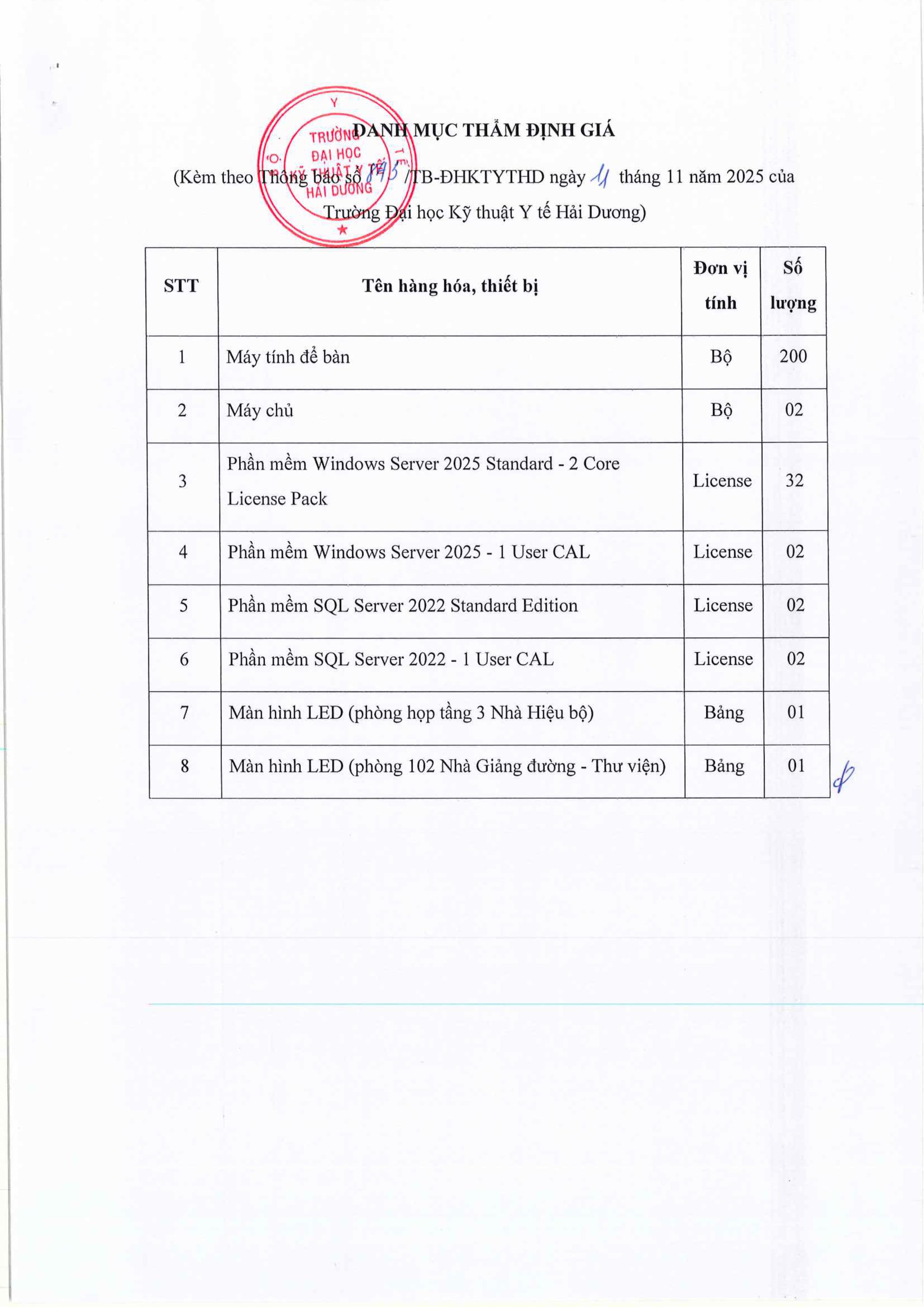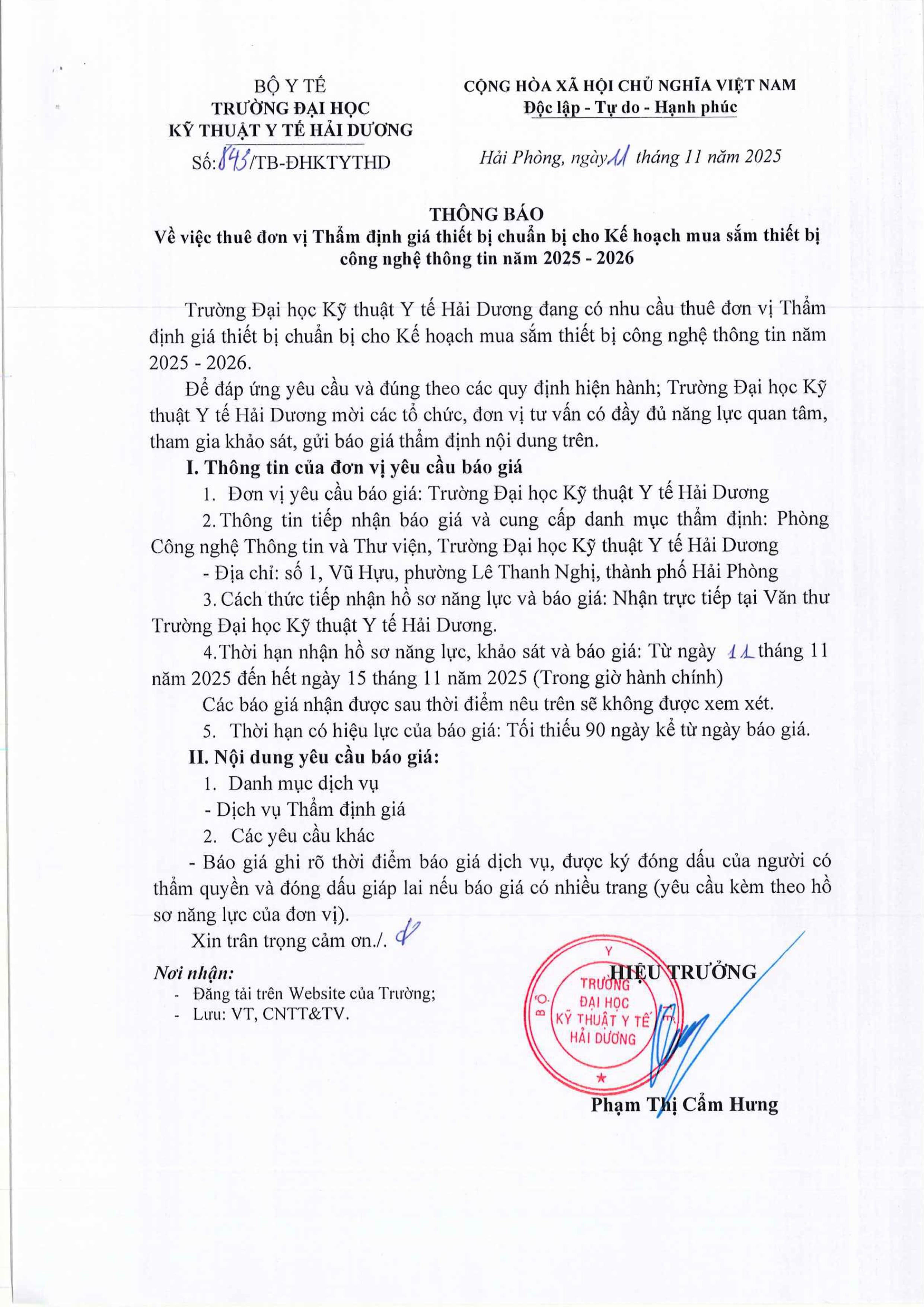 Thông báo Thông báo V/v thuê đơn vị Thẩm định giá thiết bị chuẩn bị cho kế hoạch mua sắm thiết bị CNTT năm 2025-2026 (Số 843/TB-ĐHKTYTHD ngày 11/11/2025) Author: CNTT&TV HMTU