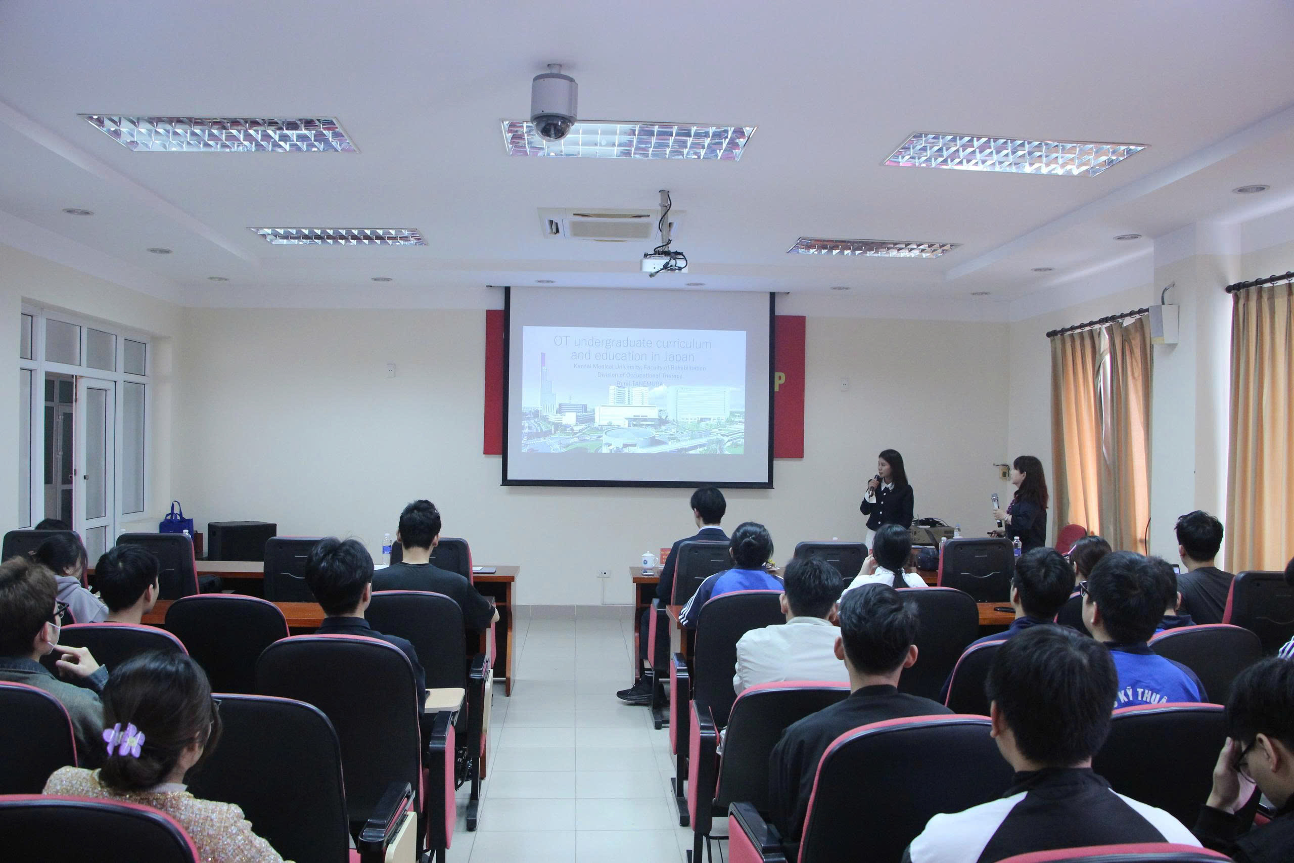 Buổi chiều cùng ngày, GS. Rumi Tanemura và GS. Shingo Hashimoto đã có buổi trao đổi với sinh viên ngành Hoạt động trị liệu về chương trình đào tạo cử nhân OT tại Nhật Bản, cơ hội học tập, cơ hội việc làm, môi trường làm việc và bài giảng chuyên sâu về nhận thức trong Hoạt động trị liệu.