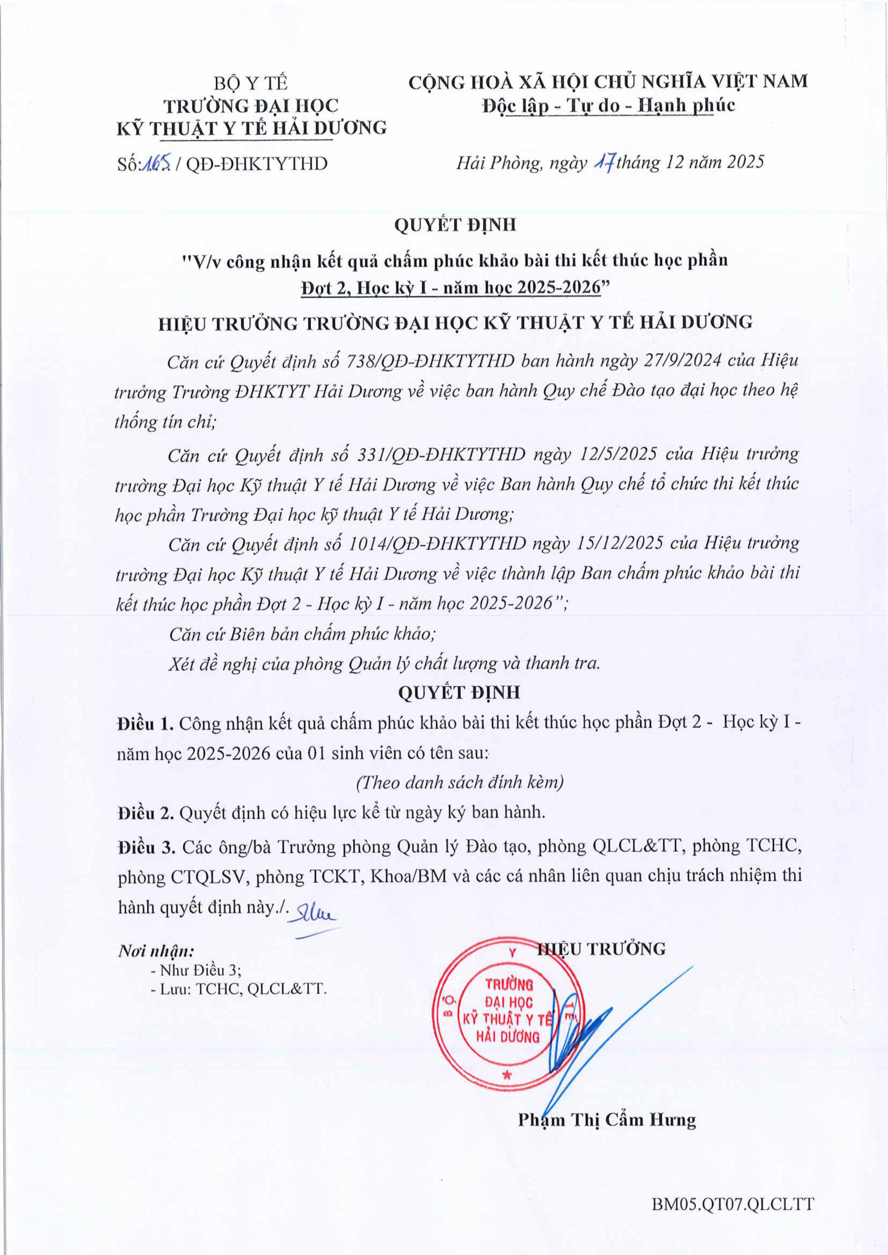 Lịch thi & Kết quả phúc khảo Kết quả chấm phúc khảo bài thi Kết thúc học phần Đợt 2 – Học kỳ I – Năm học 2025-2026 (Kèm theo Quyết định Số 165/QĐ-ĐHKTYTHD, ngày 117/12/2025) Author: CNTT&TV HMTU