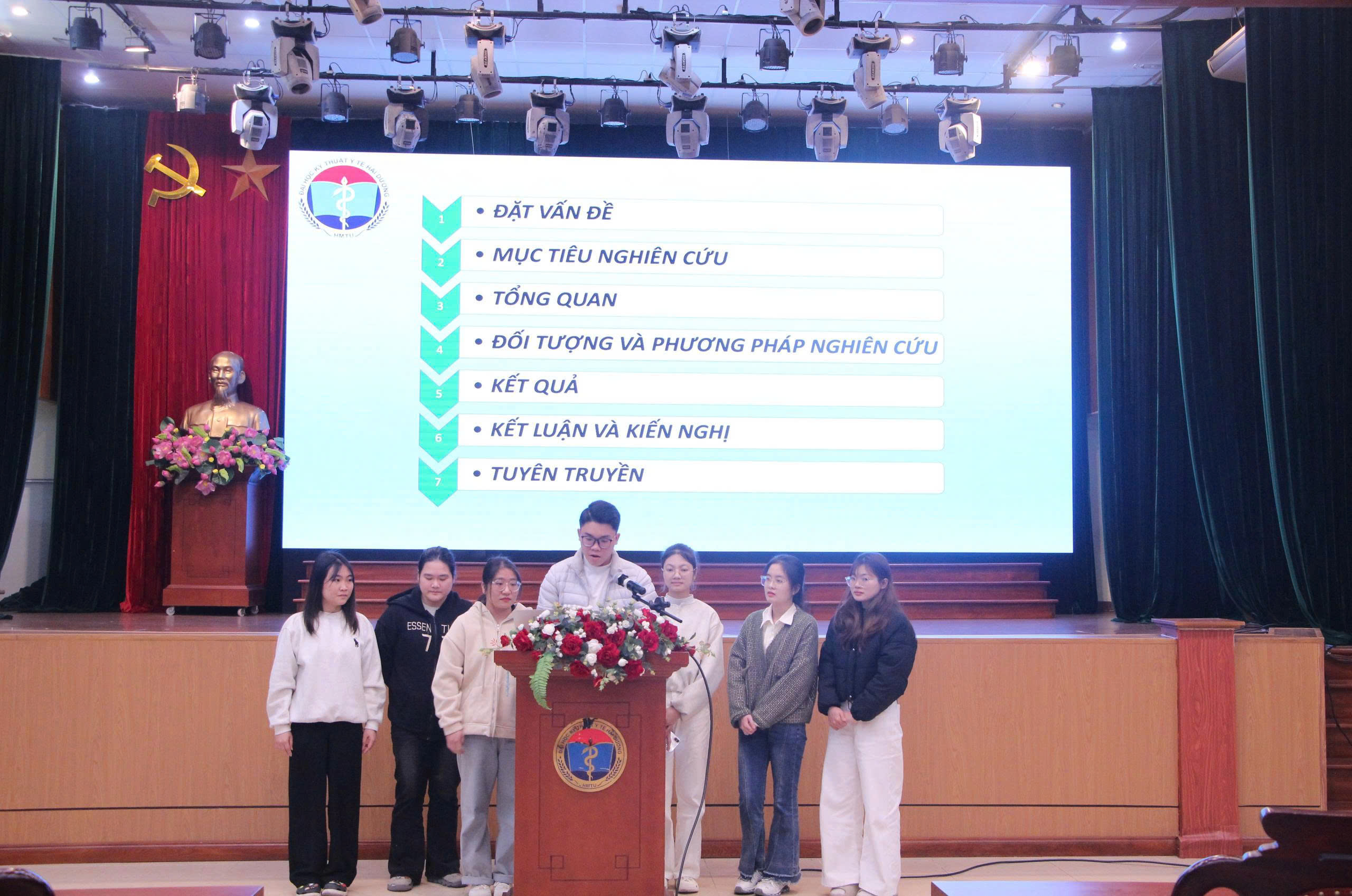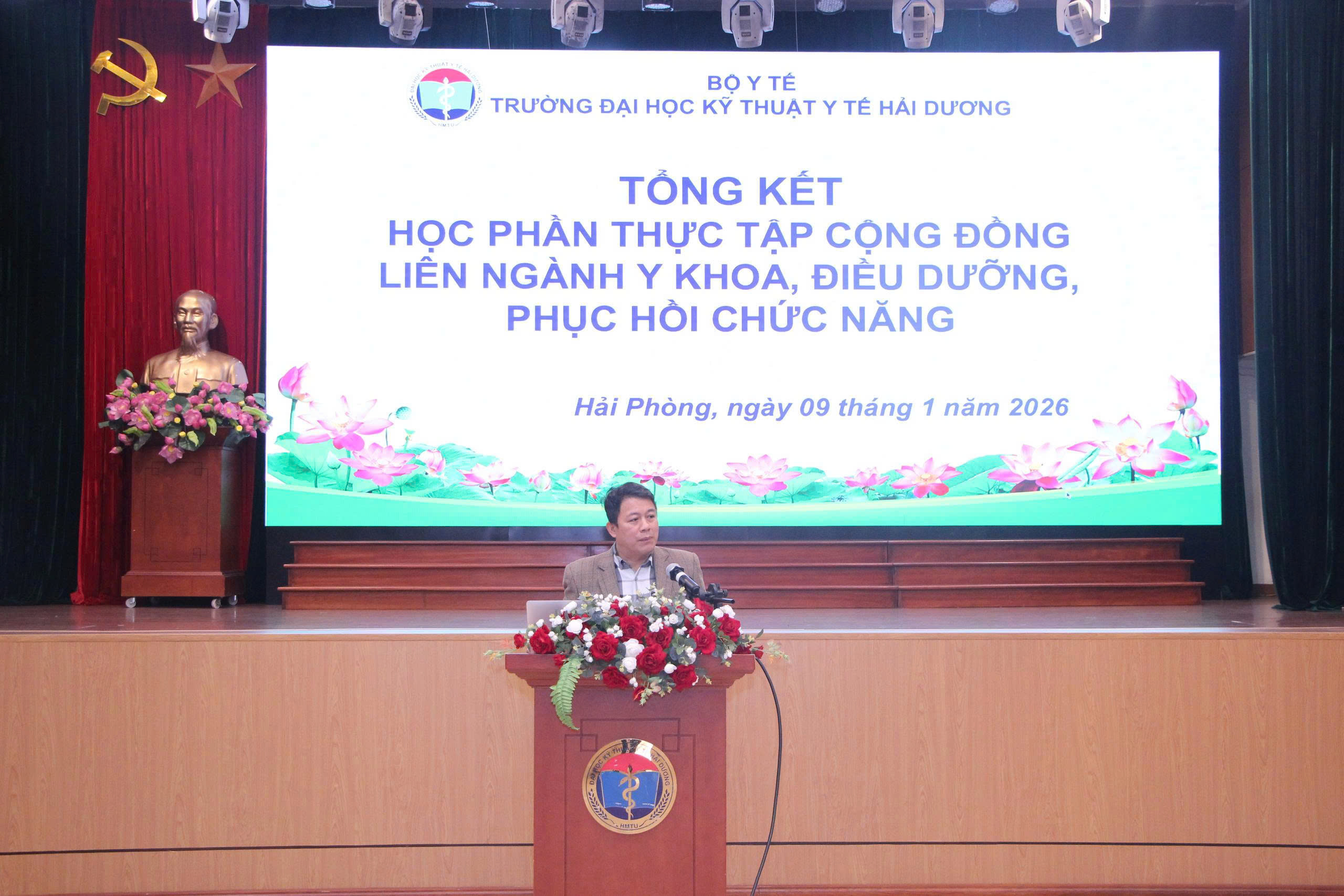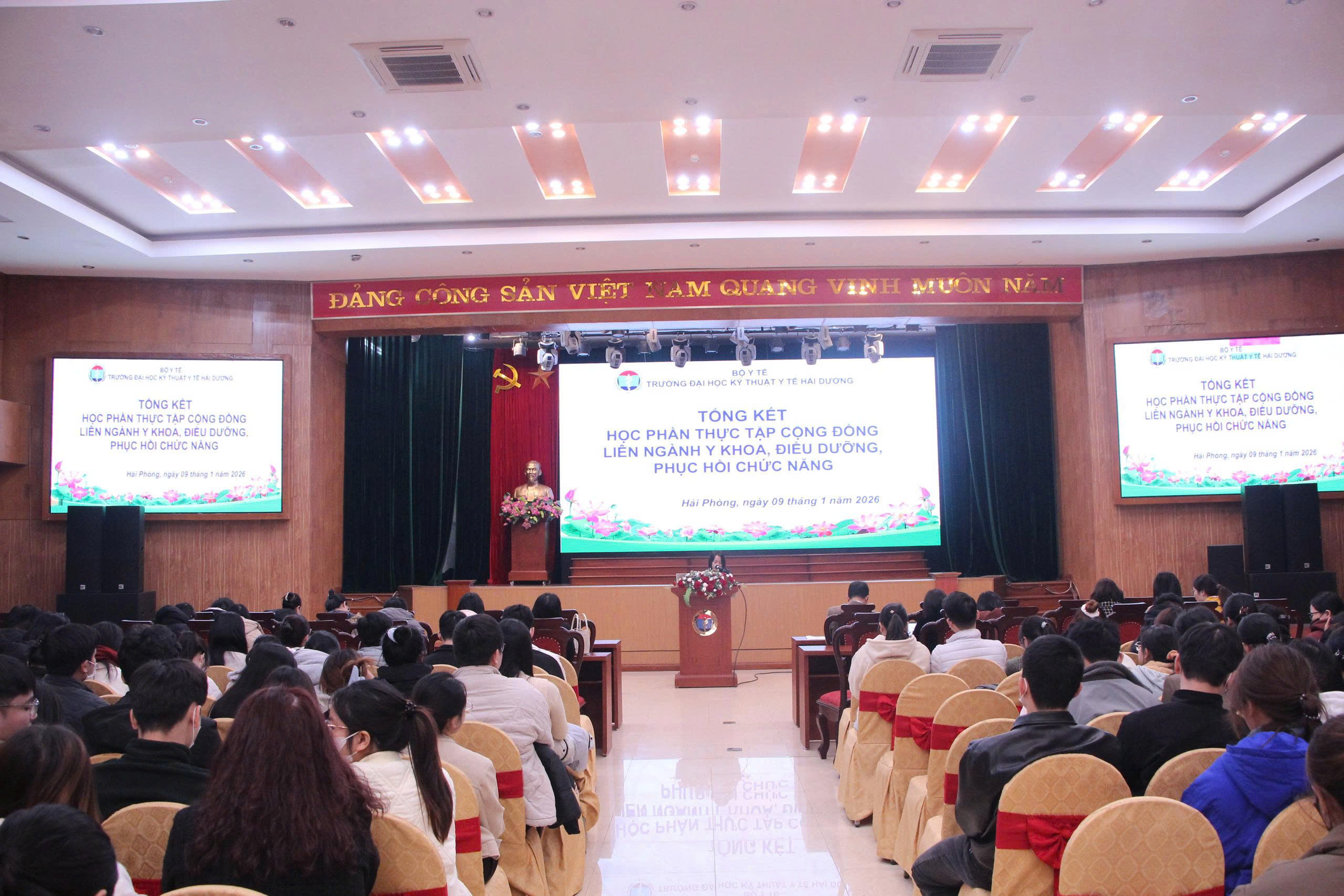 Ngày 9/1/2026, Trường Đại học Kỹ thuật Y tế Hải Dương đã tổ chức buổi tổng kết học phần Thực tập cộng đồng (TTCĐ) liên ngành Y khoa, Điều dưỡng và Phục hồi chức năng (Vật lý trị liệu, Hoạt động trị liệu, Ngôn ngữ trị liệu). Tham dự buổi tổng kết có TS.BS. Lê Đức Thuận – Phó Hiệu trưởng Nhà trường, các thầy cô cán bộ quản lý, giảng viên và sinh viên tham gia học phần.
