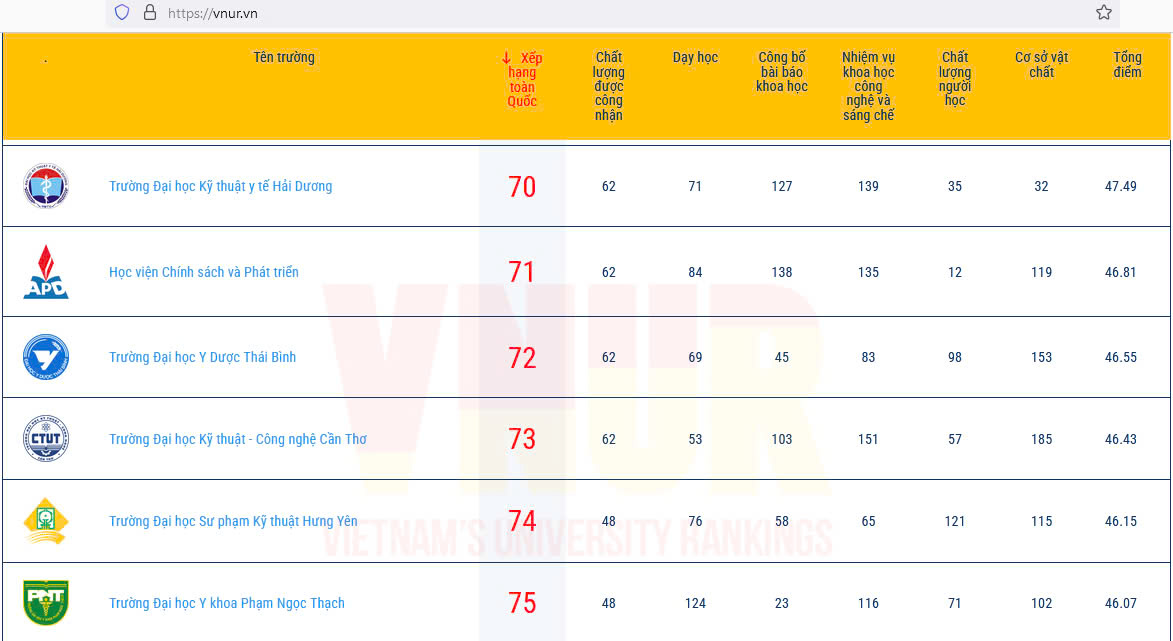 Bên cạnh đó, tiêu chuẩn “Chất lượng được công nhận” xếp thứ 62 khi Nhà trường đạt tiêu chuẩn chất lượng chu kỳ kiểm định lần thứ hai, 100% chương trình đào tạo đại học chính quy đạt tiêu chuẩn chất lượng theo chu kỳ kiểm định lần thứ nhất. Tiêu chuẩn “Dạy học” xếp thứ 71, thể hiện sự ổn định về quy mô đào tạo, tỷ lệ sinh viên/giảng viên hợp lý và đội ngũ giảng viên đạt chuẩn trình độ.