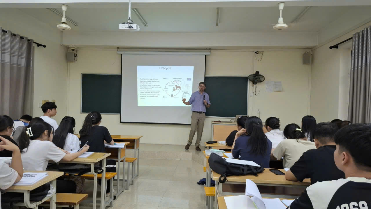 Trong khuôn khổ chương trình, PGS.TS. Stephen Greiman đã tham gia giảng dạy học phần Ký sinh trùng 1 cho 2 lớp sinh viên ngành Kỹ thuật Xét nghiệm Y học năm 2, với tổng thời lượng 30 tiết lý thuyết và 60 tiết thực hành. Hoạt động đào tạo được triển khai đúng kế hoạch, bám sát đề cương chi tiết học phần, đảm bảo yêu cầu chuyên môn và gắn kết chặt chẽ giữa lý thuyết và thực hành, giúp sinh viên tiếp cận phương pháp giảng dạy hiện đại, nâng cao kỹ năng thực hành và khả năng tư duy nghiên cứu trong lĩnh vực ký sinh trùng học.