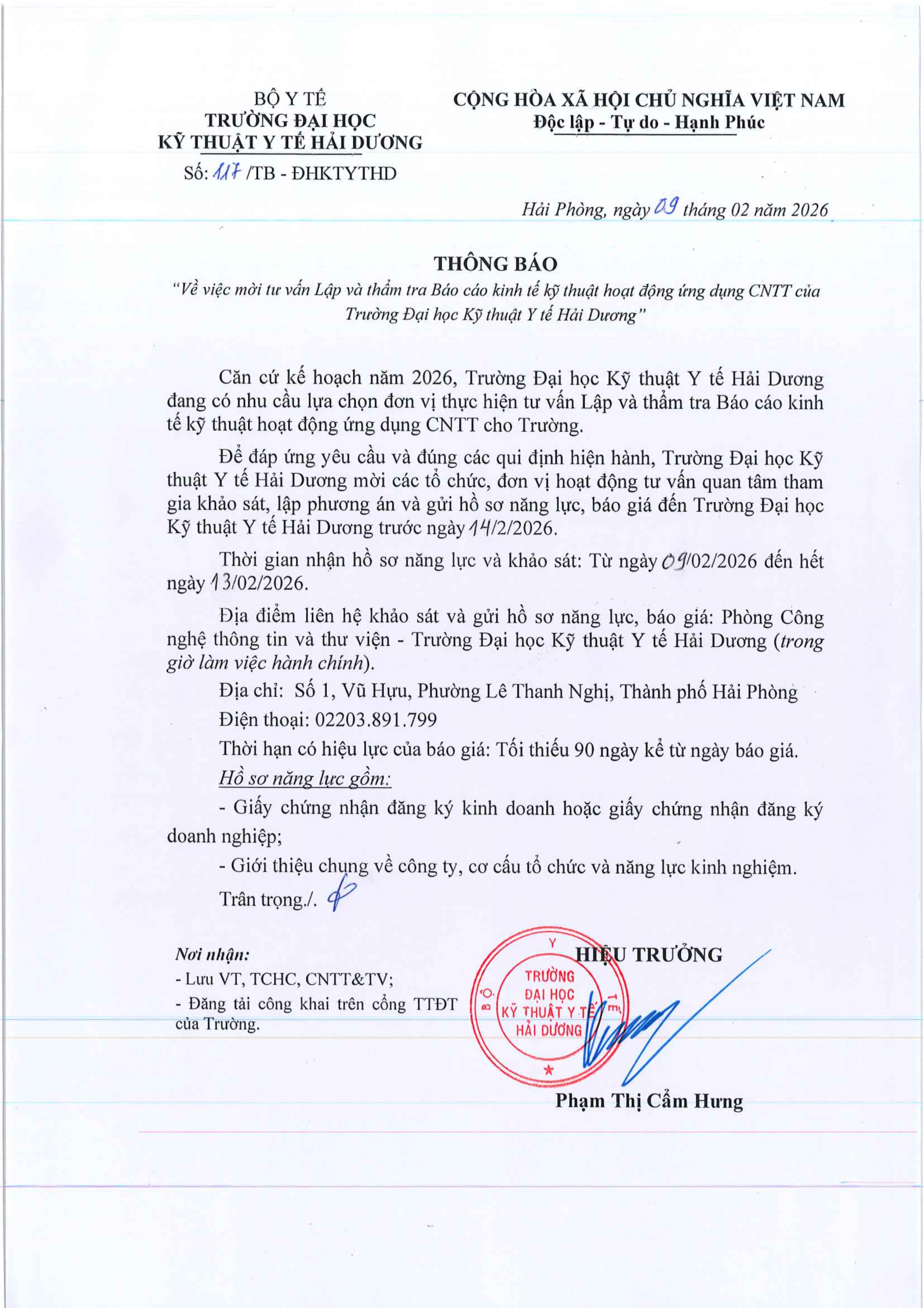 Thông báo Thông báo về việc mời tư vấn Lập và thẩm tra Báo cáo kinh tế kỹ thuật hoạt động ứng dụng CNTT của Trường Đại học Kỹ thuật Y tế Hải Dương ( số 117 ngày 09/02/2026) Author: xuan tran