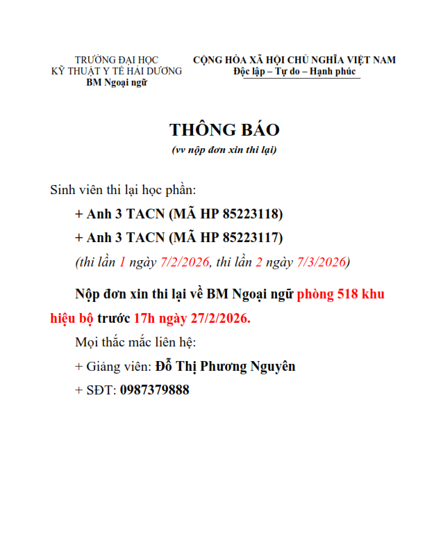 Tin tức sinh viên Thông báo nộp đơn xin thi lại học phần Anh 3 TACN (mã học phần 85223118 và 85223117) Author: xuan tran