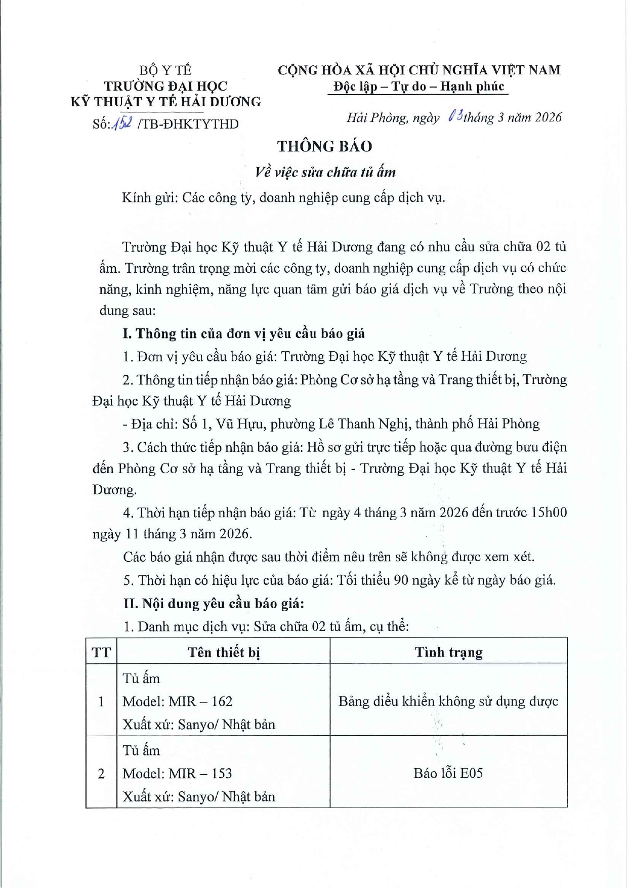 Thông báo Thông báo về việc sửa chữa tủ ấm của Trường Đại hoc Kỹ thuật Y tế Hải Dương (Số 152/TB-ĐHKTYTHD ngày 03/03/2026) Author: xuan tran