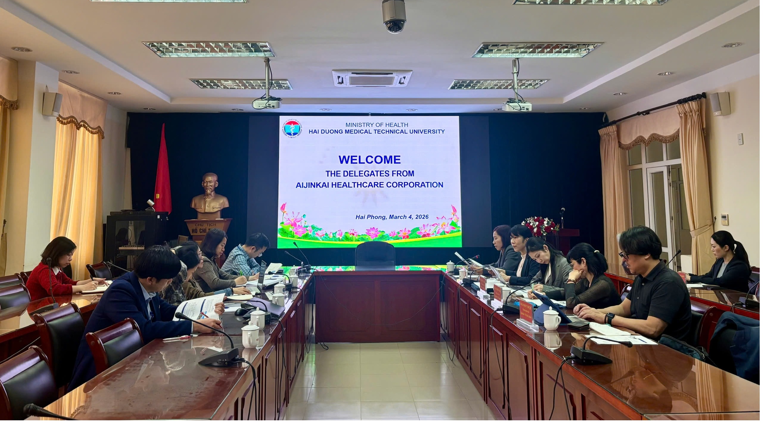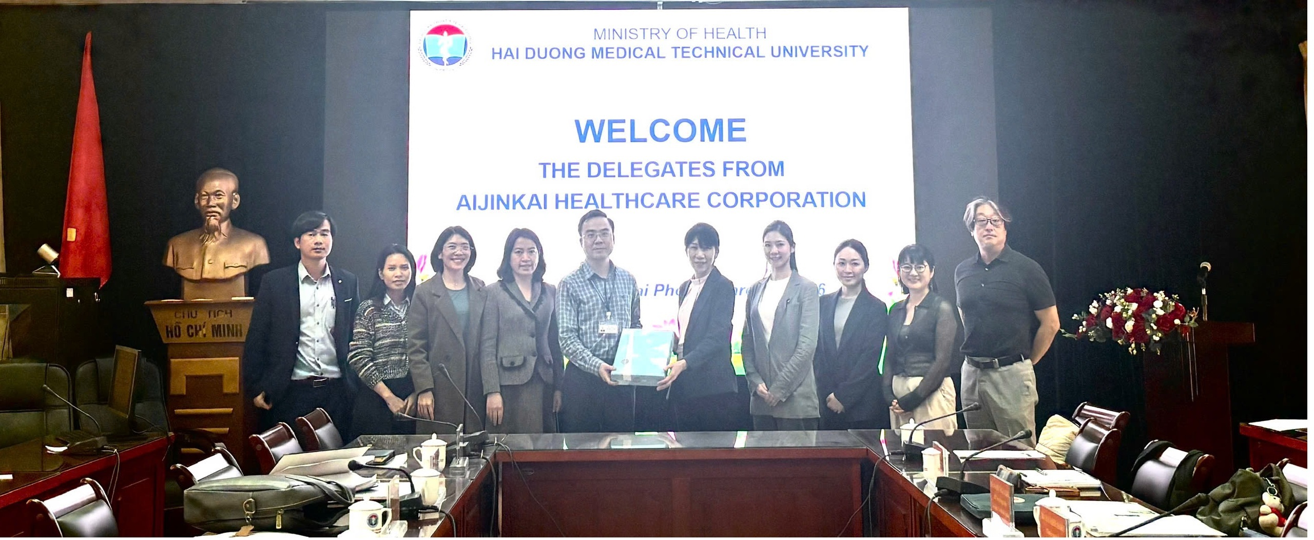 Ngày 04/03/2026, Trường Đại học Kỹ thuật Y tế Hải Dương đã làm việc với đoàn công tác của Tập đoàn Y tế Xã hội Aijinkai (Nhật Bản).