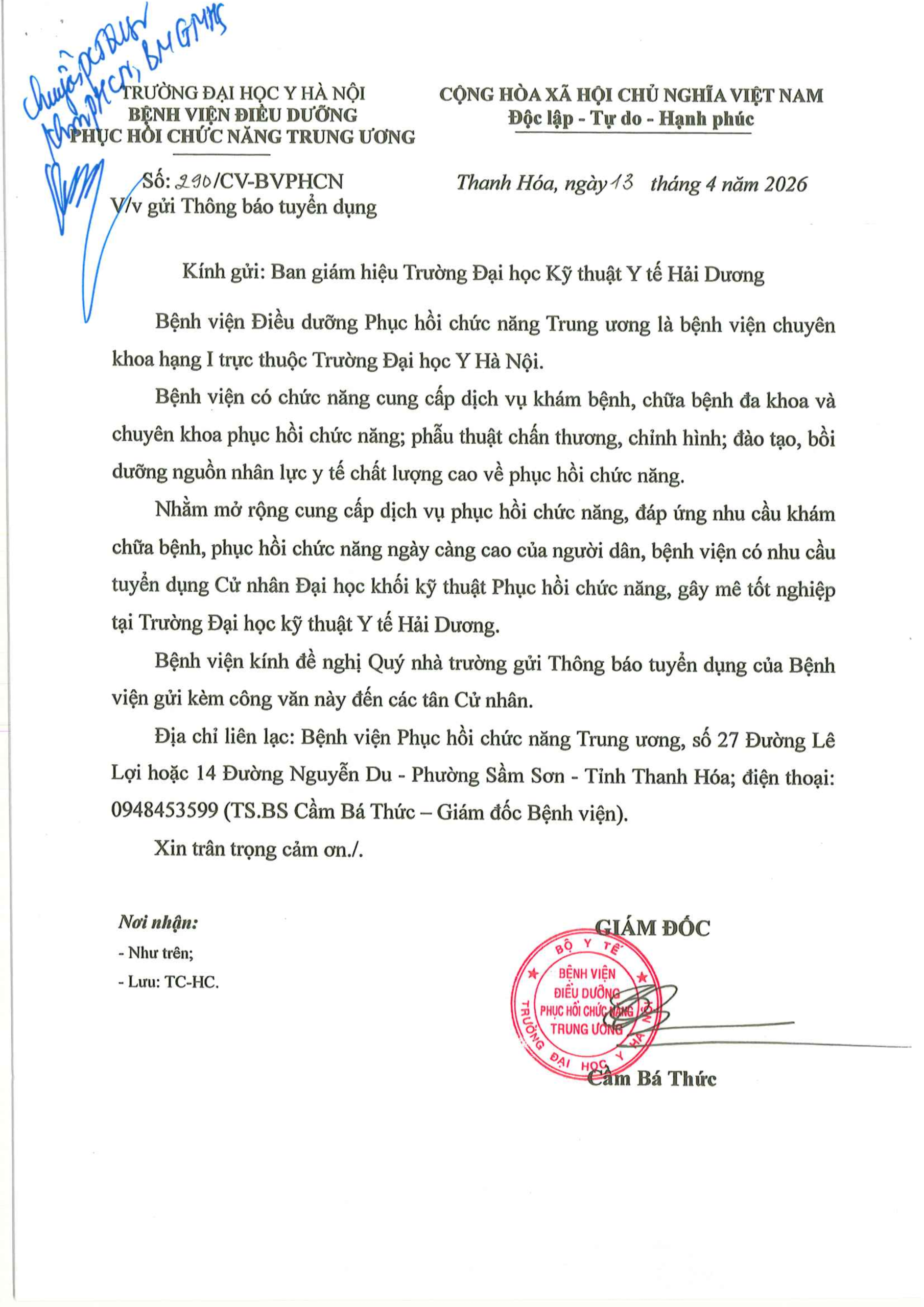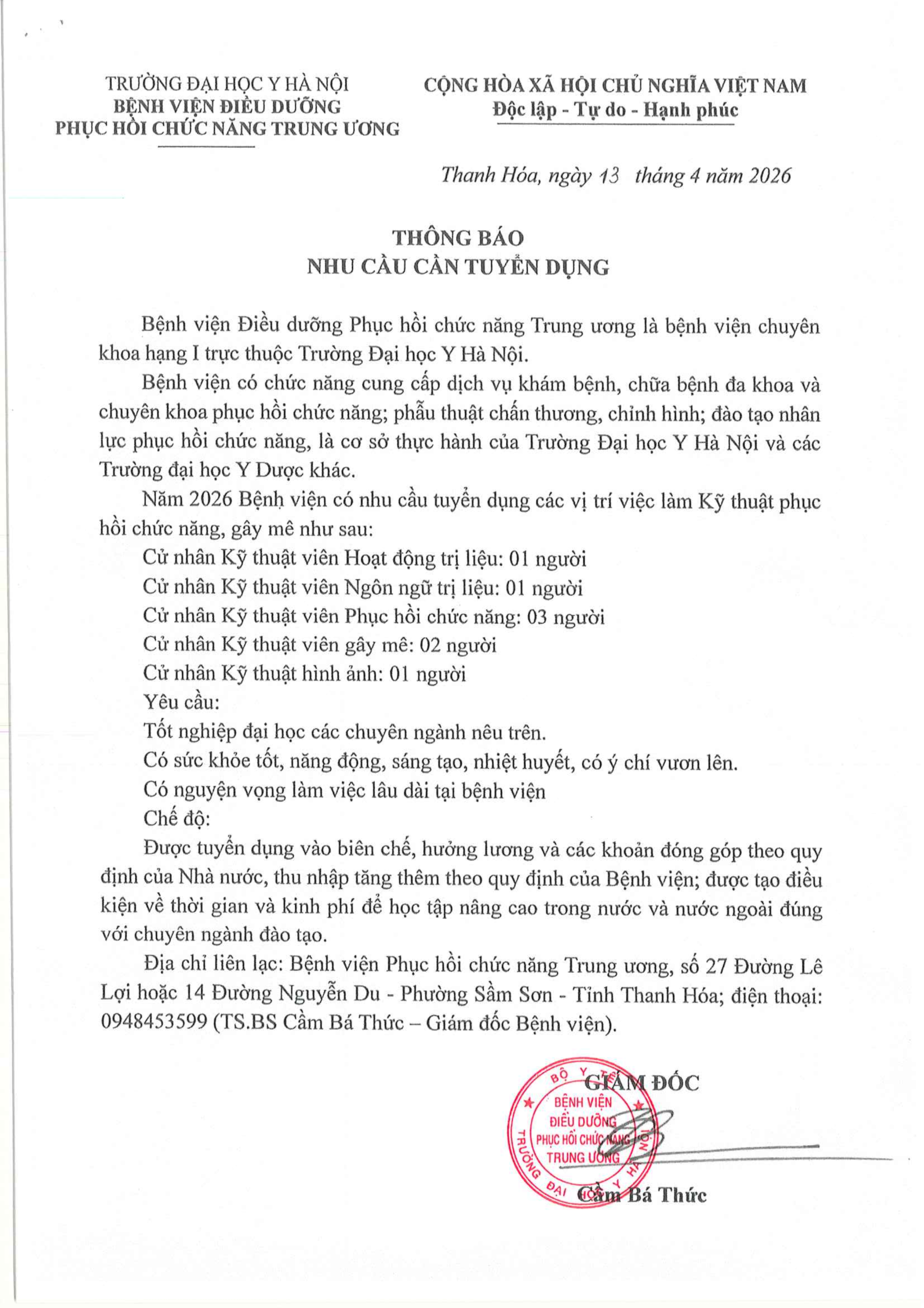 Hướng nghiệp - Việc làm Thông tin tuyển dụng của Bệnh viện Điều dưỡng Phục hồi chức năng Trung ương – Đại học Y Hà Nội – Năm 2026 Author: xuan tran